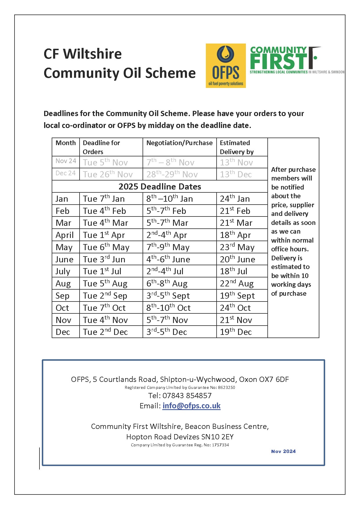 The Community First Bulk Oil Buying Scheme is managed by Oil Fuel Poverty Solutions (OFPS) and aims to reduce the cost of your domestic heating oil. By bringing communities in Wiltshire together and making the most of joint buying power, we can make savings and pass them directly to people like you whose fuel costs are high simply because you use oil-fired central heating.
